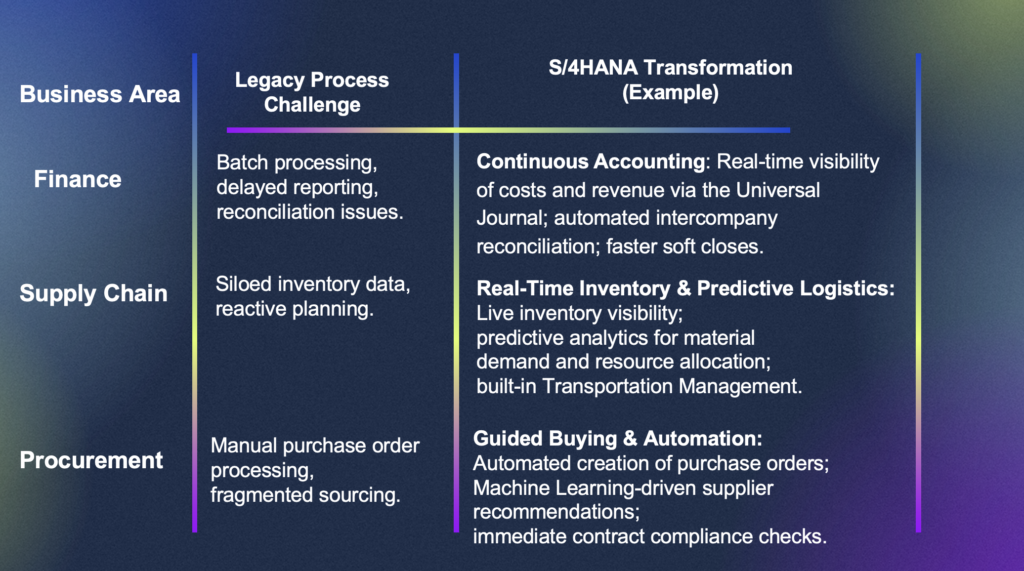 • Real-Time Data & Simplified Data Model: The in-memory HANA database eliminates the need for separate aggregation and reporting tables (e.g., the introduction of the Universal Journal in Finance). This enables instant access to operational data, transforming processes like the month-end close from a prolonged event to a continuous activity.