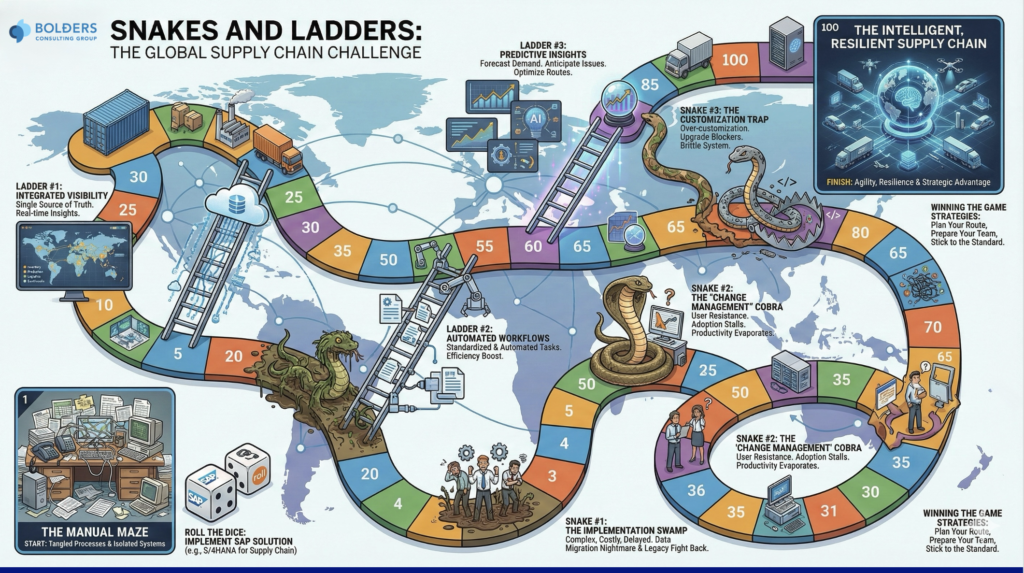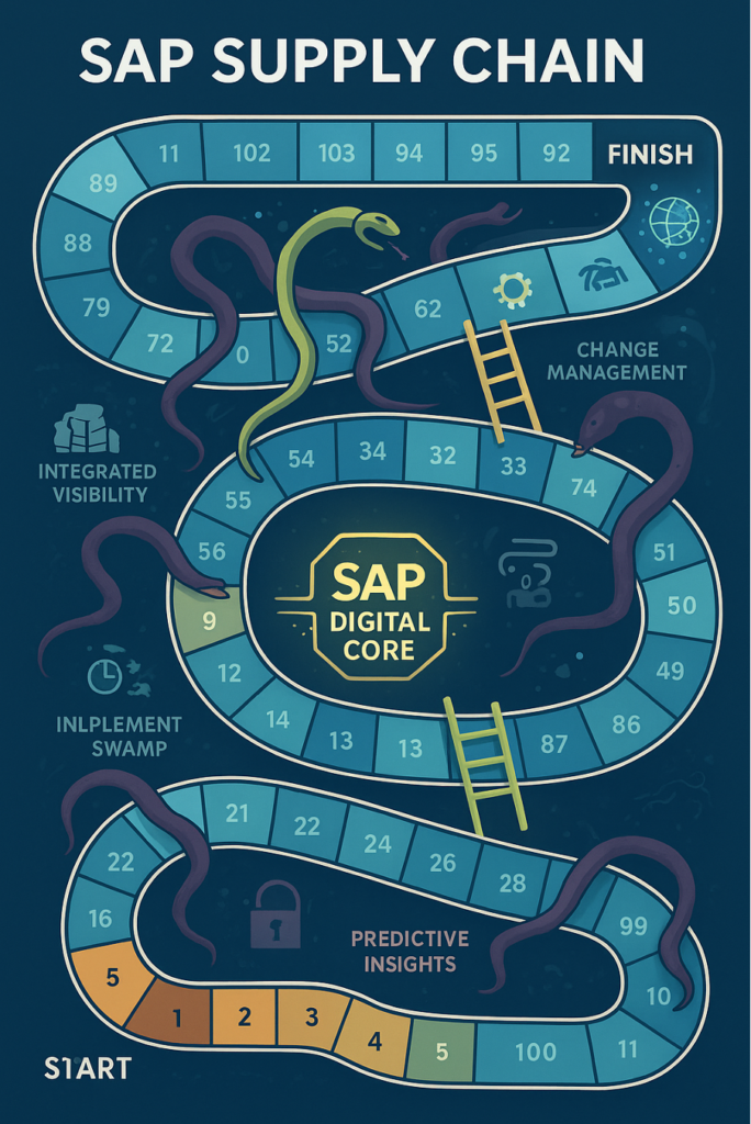 Imagine your global supply chain not as a linear process, but as a giant, complex board game. The goal is to reach the final square: “The Intelligent, Resilient Supply Chain.” The dice you roll to move forward? That’s the decision to implement an SAP solution. Welcome to the high-stakes game of SAP Snakes and Ladders. Every move on this board represents a strategic decision or an operational reality. Some will propel you forward with surprising speed these are your Ladders. Others will send you sliding back to square one, forcing you to rethink your strategy these are your Snakes. Let’s roll the dice and see what happens when an SAP solution enters the game.